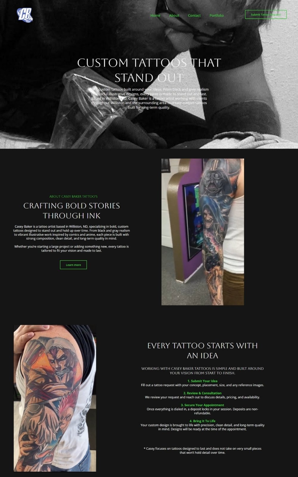 Custom tattoo artist site built for a solo artist in Williston. Includes a tattoo request form with detailed intake questions, booking calendar, deposit collection, appointment reminders, no-show recovery, aftercare automation, and a Google review request system.