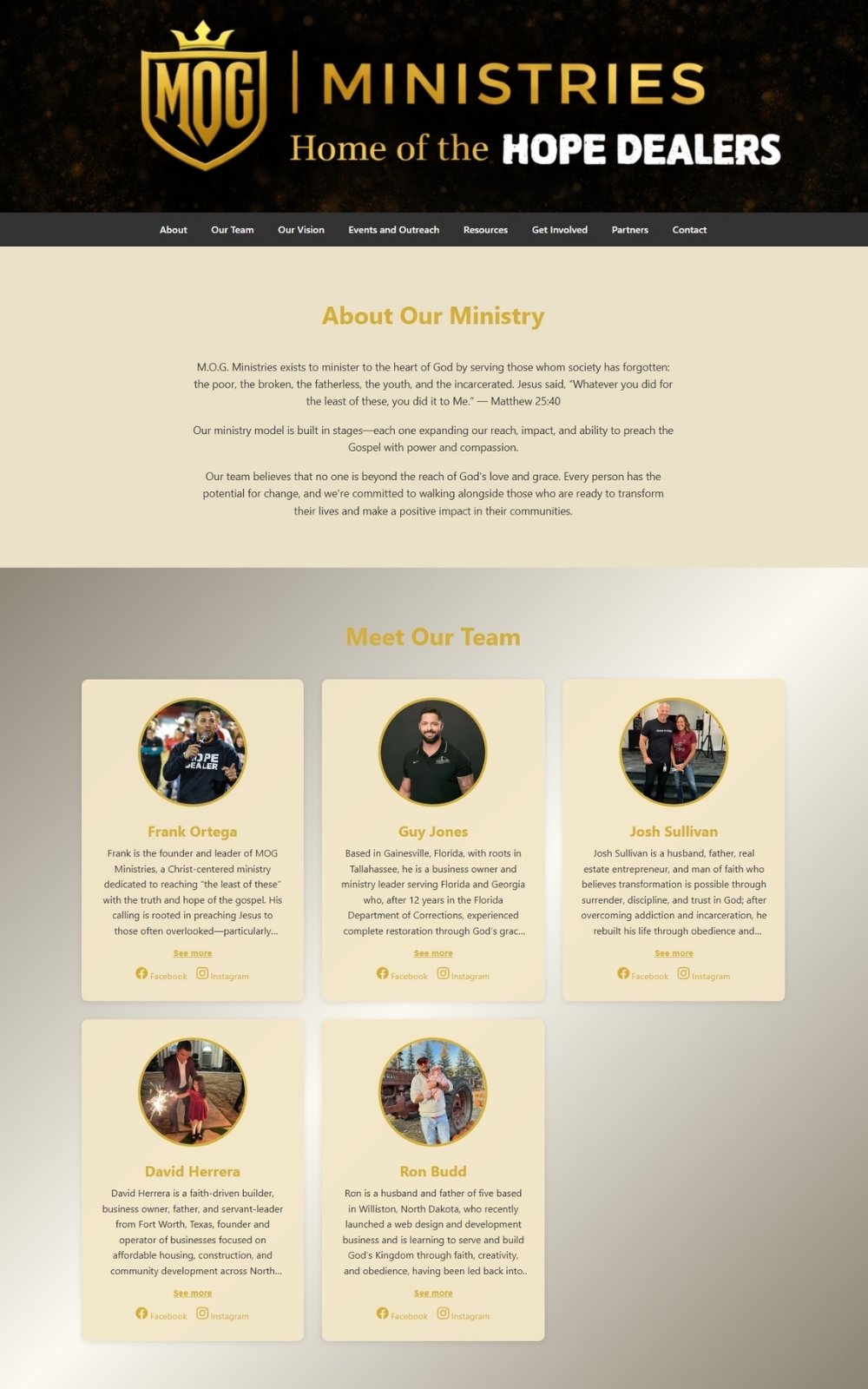Website built for a traveling ministry focused on prison outreach, youth ministry, and evangelism across the United States. Full team page, two-stage vision and outreach breakdown, events calendar, get involved section, and partner showcase.